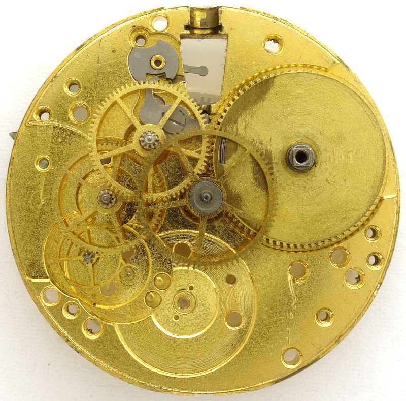The gear train itself is standard at the time and consists of a mainspring barrel, center minute wheel, third wheel, seconds wheel at 6 o’clock (90° to the winding mechanism, i.e. hunter-style), and escapement wheel.