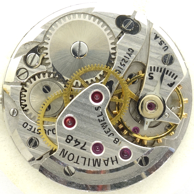 At the end of 1940s, the very high-quality, rather small caliber Hamilton 748, with a diameter of only 23.7mm (American size 8/0s or also 10 1/2 lignes according to European standards), came onto the market, attracting attention with its very unusual construction of the direct central seconds hand indication.