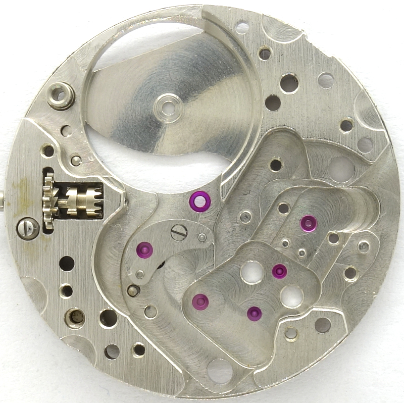 Except for the mainspring barrel, all bearings, even that of the minute wheel, are jeweled. And as you can see at 8 o’clock, the bearing of the third wheel even has an extra bearing with a bridge.