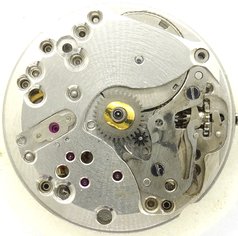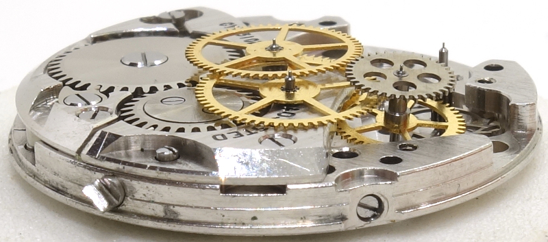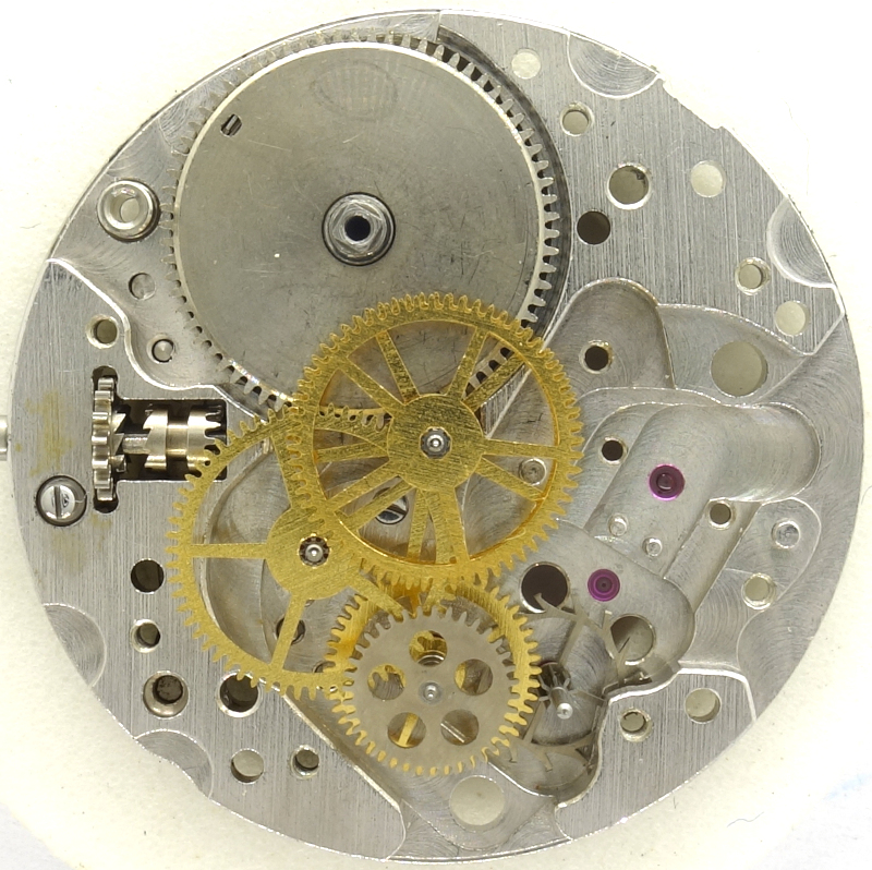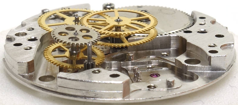 The gear train has one more wheel than usual: The mainspring barrel drives the central minute wheel, followed by the third wheel, central seconds wheel, seconds wheel (with a very large pinion, actually even a separate wheel) and the escape wheel, which is recognizably counterclockwise.