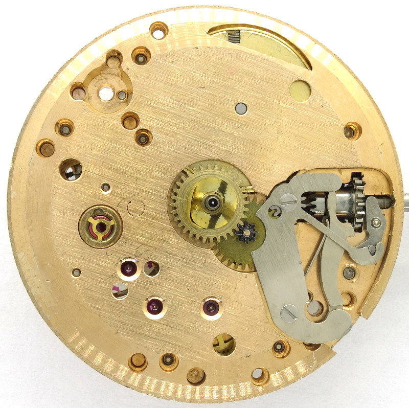 The third wheel simultaneously drives the seconds wheel and the central seconds pinion, which runs in a lowered bearing of the gear train bridge. A friction spring underneath ensures that it does not flutter or jump. This construction was patented by Junghans in 1952.