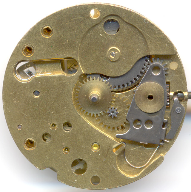We see the typical gear train for this kind of movements: Directly driven center minute, second wheel, fourth wheel, escapement wheel. With a longer pivot, the fourth wheel could carry a decentral second hand. Here it has got the short pivot.