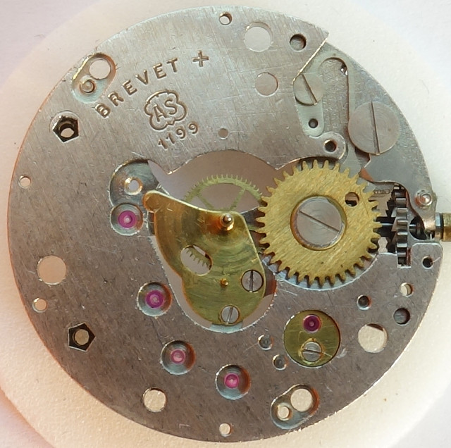 The AS 1199 has got the usual Roskopf gear train, which in contrast to the gear train of classical swiss lever movement, one transmission step was saved. The mainspring barrel is overdimensional large and reaches over the center of the movement. The following second and third wheel are also larger (and have more teeth) and finally the silver toned escapement wheel has got only 15 teeth instead of 18, which were standard on true Roskopf movements.