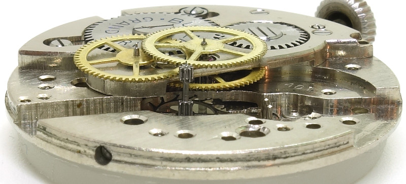 The gear train of this “Grand Prix” movement is the traditional one and builds pretty high: The mainspring barrel drives the center minute wheel, followed by third wheel, directly driven center seconds wheel and finally the escape wheel.