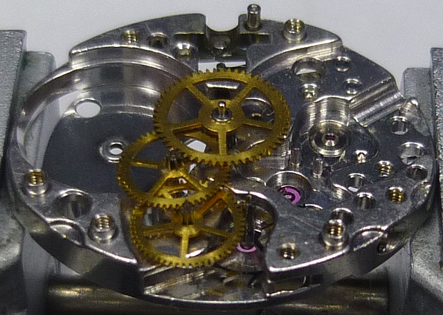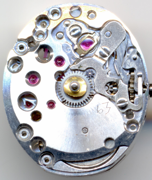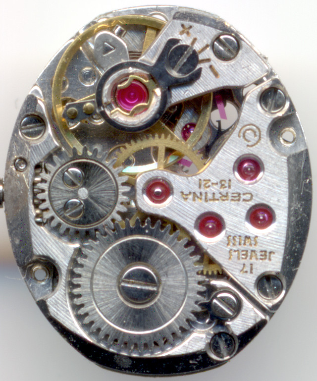 The Certina 13-21 has got ruby bearings of very high quality. Besides the saturated red color, you can see, that they are not flat, but contain holes for better oil storage.