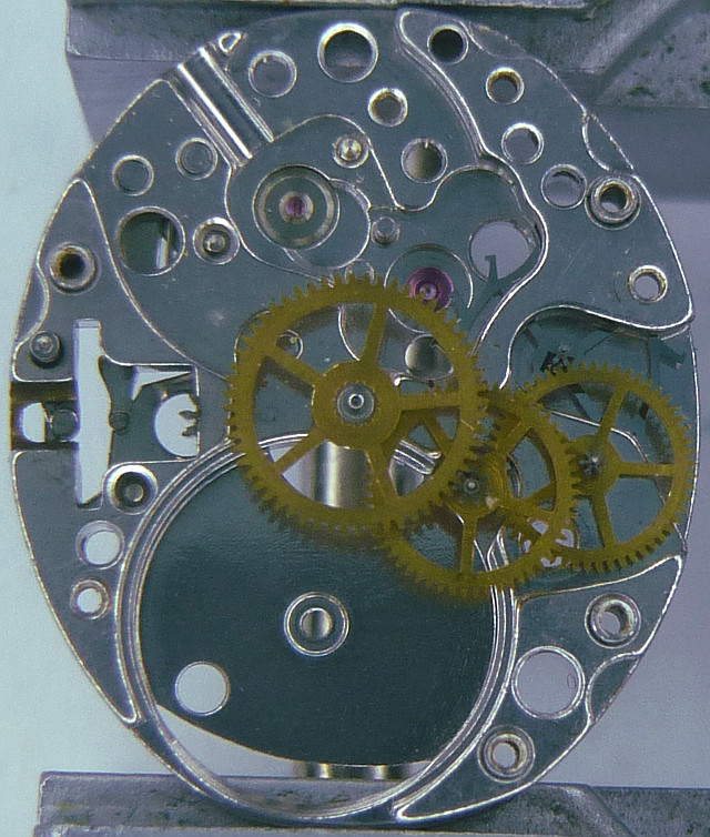 On the dial side, you can see the large and uniquely shaped setting lever spring and the Incabloc bearing, which has got a little different shape of the lrya.