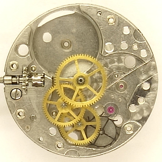Very classic, and therefore typical of the 1950s is the gear train. The barrel drives the central minute wheel directly, followed by the third wheel, fourth wheel at 6 o’clock and the very filigree steel escape wheel.