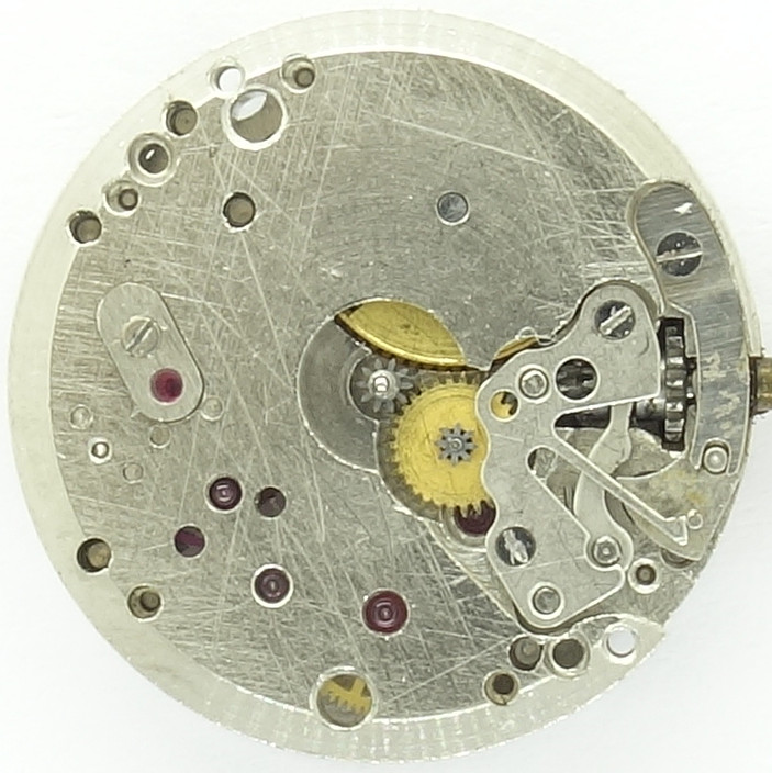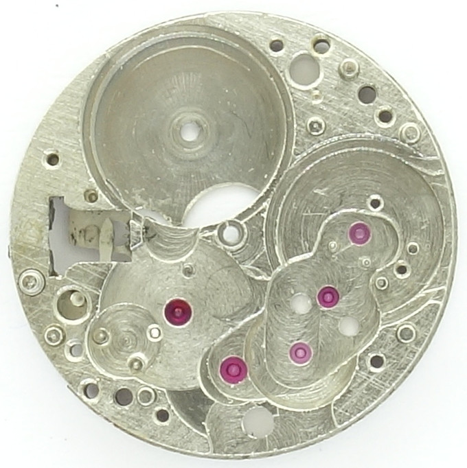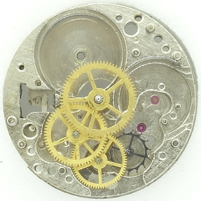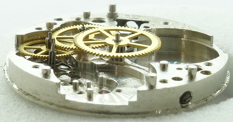 The Chaika 1600 uses the classical grar train with a relatively large mainspring barrel, followed by the directly driven center minute wheel, third wheel, fourth wheel and steel escape wheel.