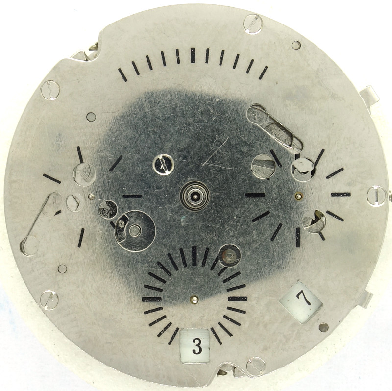 The calendar mechanism is covered by a metal cover plate, on which subdials are printed. Despite this rather unique design, this didn’t help with identification.