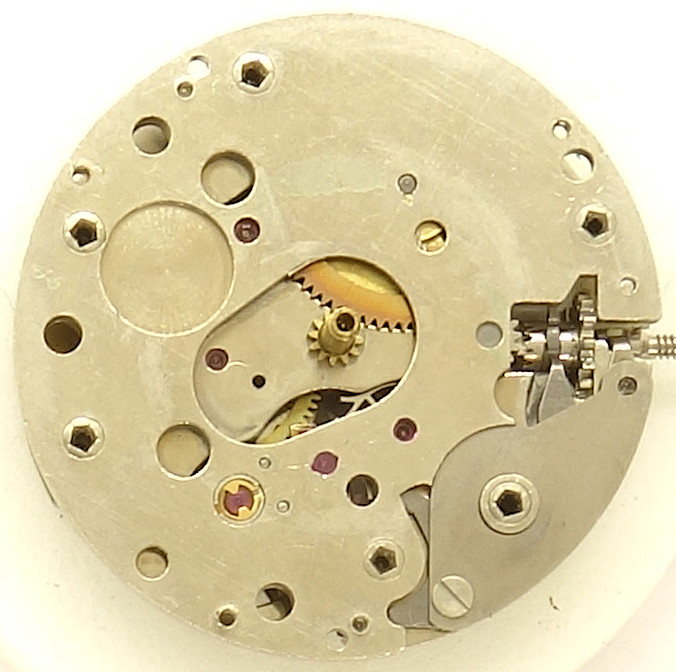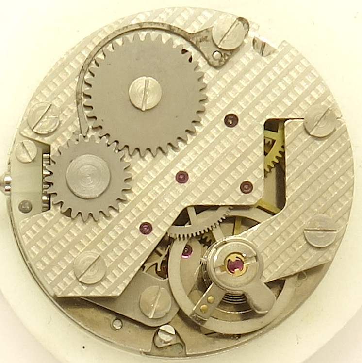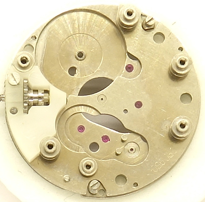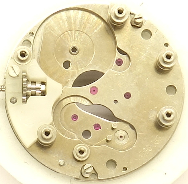The base plate of this pillar movement shows on the left the plastic bearing of the winding system. Besides that, you’ll notice, that all important bearings contain rubies, which is not often to be seen on pillar movements.