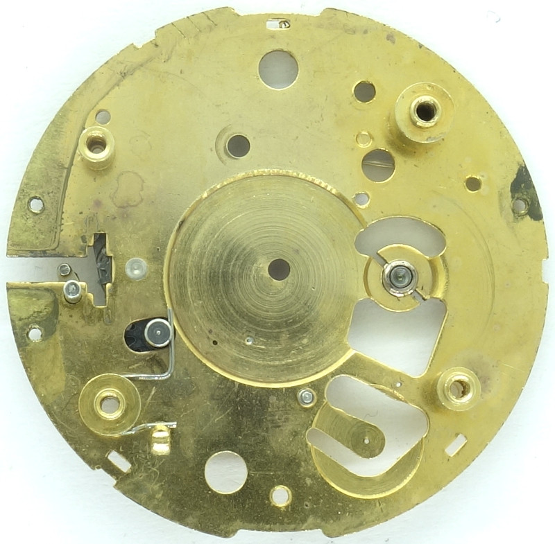 Another speciality of this movement is, that it is mounted onto a meal plate with three spring arms, resulting in a true diameter of almost 30mm. Junghans even claimed an utiliy model (Gebrauchsmuster) therefor.