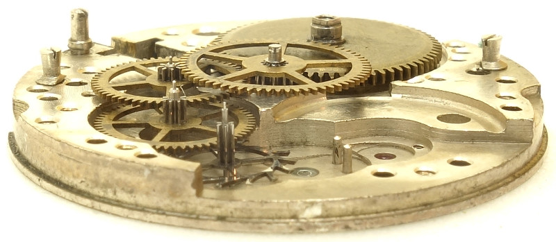 On the dial side, you see the yoke winding system, whose setting lever spring war “repaired” a bit shirt-sleeved.