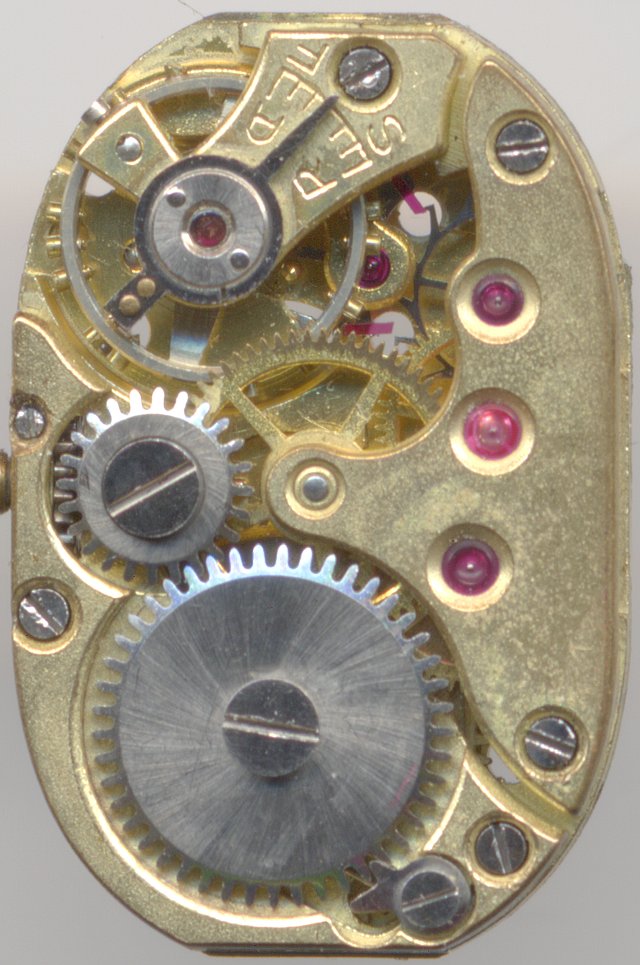 Its construction is very classic with its gilt toned plates, which edges are angled, the non shock protected screw balance and the long regulator arm for adjusting the effective hairspring length. The gears are all in one layer. Due to that, the shape of that movement results in one long side.