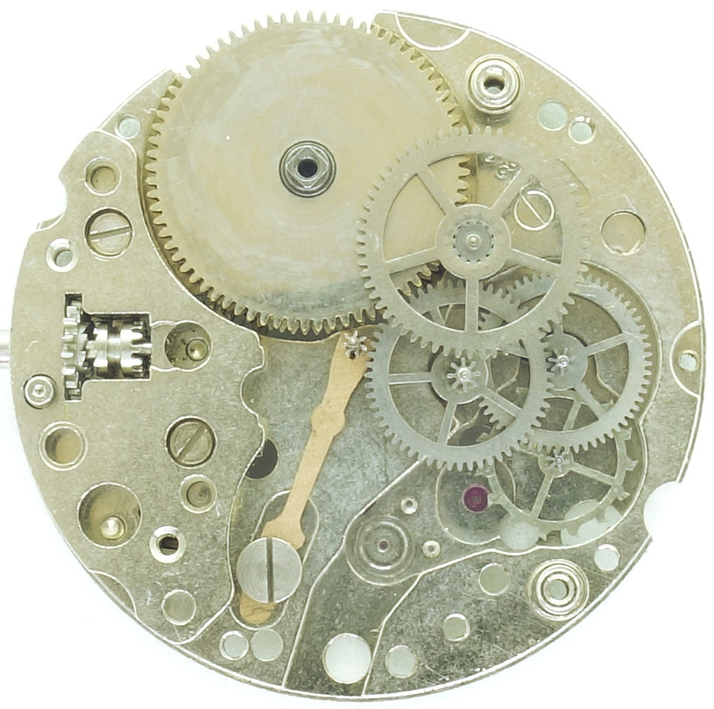 As common on Roskopf movements, the hands setting wheel does not engage with the cannon pinion, but with the top gear of the mainspring barrel, which drives, as described above, the cannon pinion.