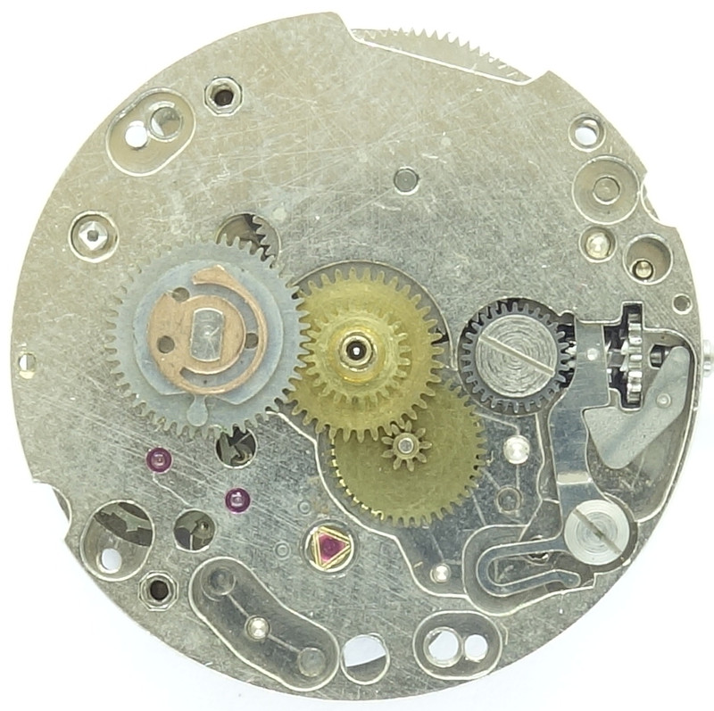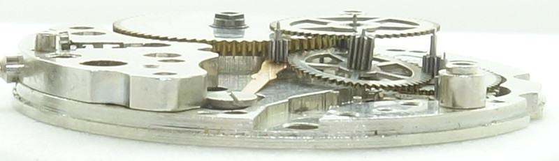 Usually, Roskopf movements have one transmission step less, compared with traditional lever movements. The Ebosa 681 is different, here, the mainspring barrel is followed by four wheels: Second wheel, third wheel, seconds wheel and lever wheel. The center second pinion is driven indirectly by the third wheel.