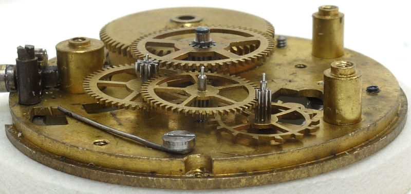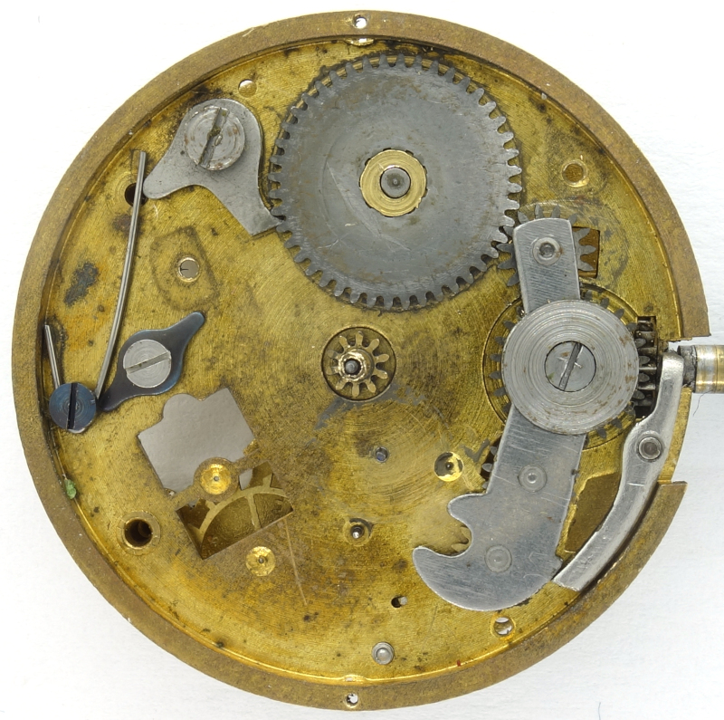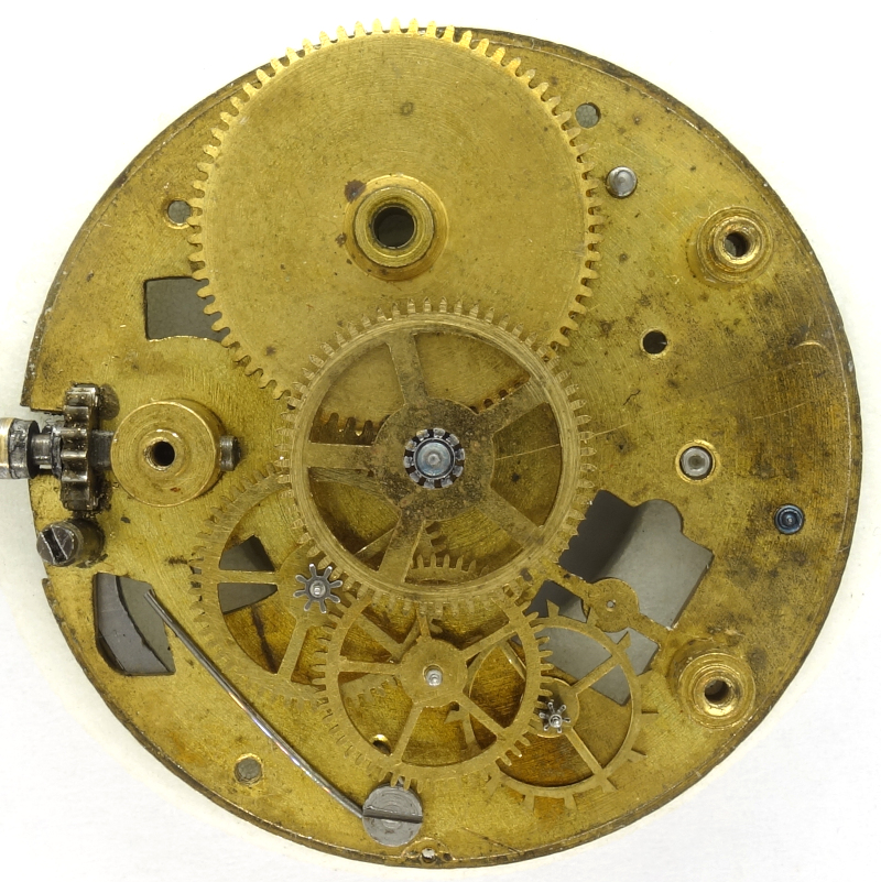 This is a simple pin lever movement, with even the minute wheel and barrel riveted on the dial side, making them irremovable, or at least not by laymen.