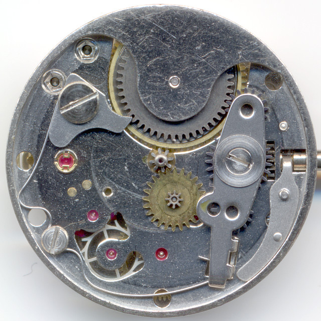 Since the minute wheel is double ruby beared (the top, detachable, ruby is also the bearing for the indirectly driven center second, which is only beared on that side, and which is secured a bit by a spring), even without cap jewels, this movement has got 17 jewels.