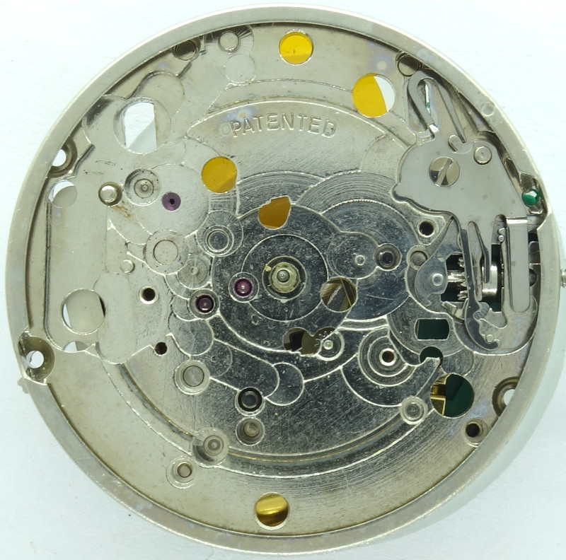 The base plate of this 11 1/2 ligne movement shows, that we have the Lavet stepper motor construction, a principle which is standard until today. Hard to believe, that the introduction of this construction already in the mid 1970s successfully finished the research of the best quartz wristwatch movement implementation.