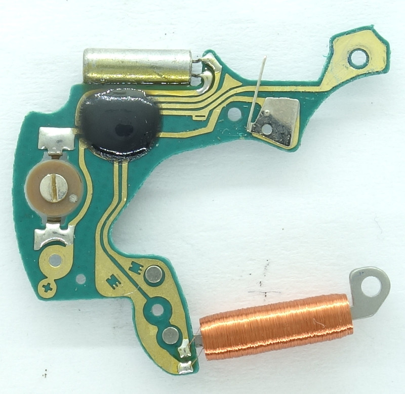 The electronics is contemporarily small, the chip is bonded as a black blob onto the PCB, the quartz has got a tiny diameter, but we still have a trimmer capacitor to adjust the accurancy.