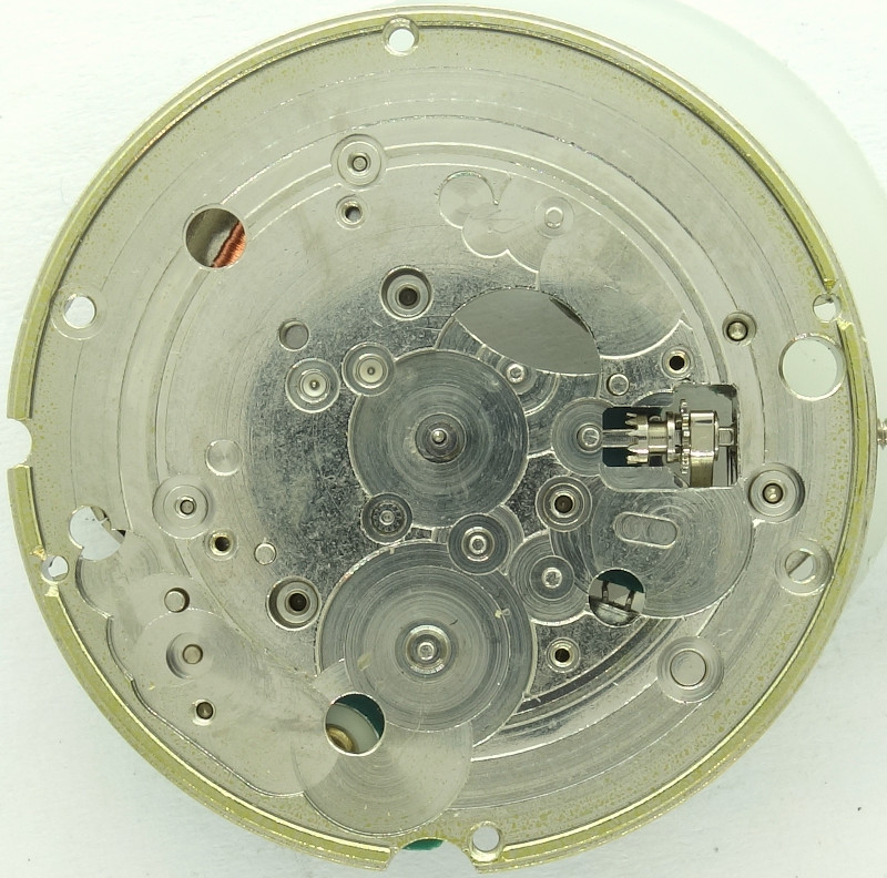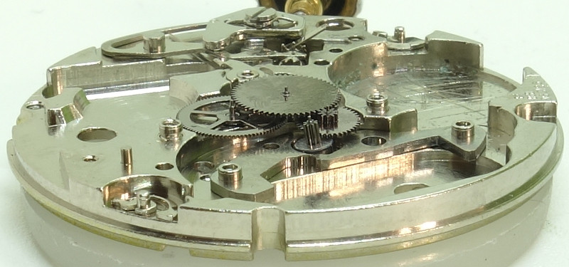 With the large minute wheel, on which the cannon pinion is attached to with a slipping clutch, the hands works are similar to those of the familiar mechanical ETA calibers.