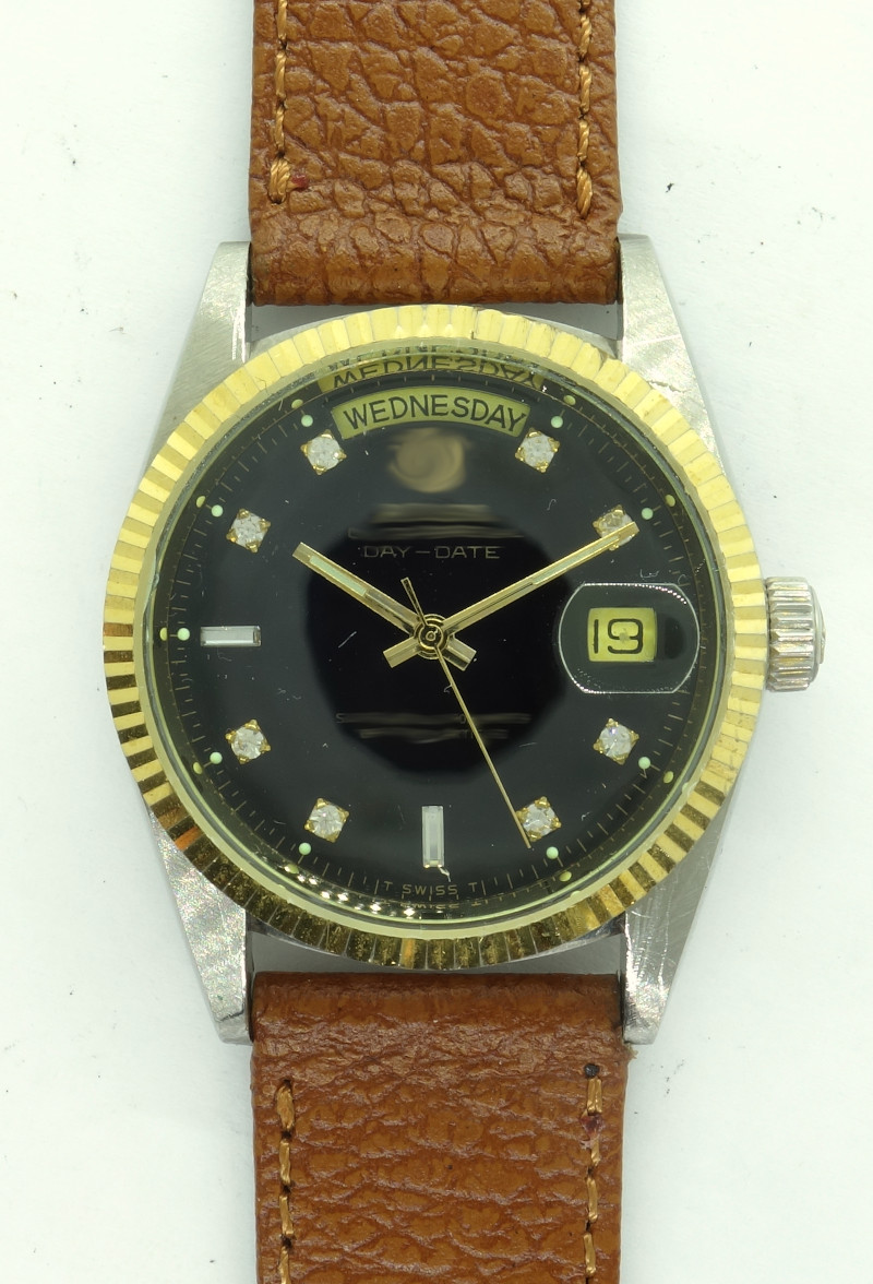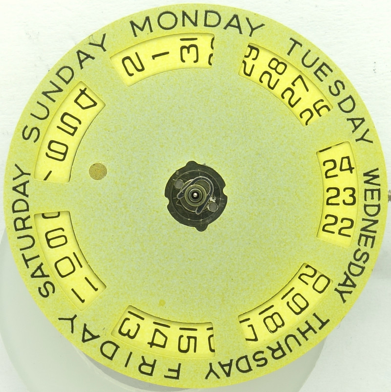 The weekday disc is made in a way, that the weekday is written in full on the outside of the date ring. It has got a star wheel on its lower side, which is used for advancing and holding it in position.
