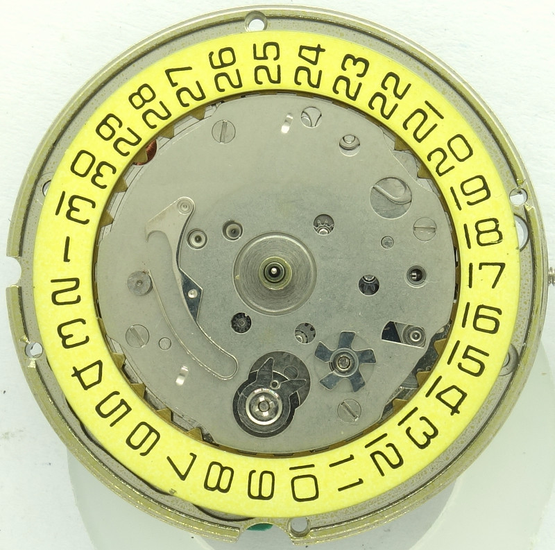 The calendar mechanism is covered with a plate, under which the two gears of the correcting mechanism are beared.