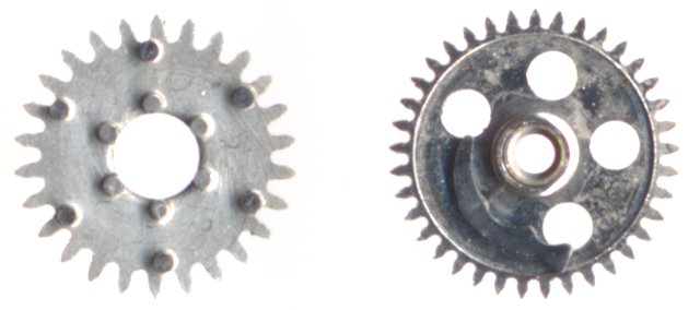Under the loupe, you can see the two parts of the pawl winding wheel: In one direction, the click runs freely, in the other one, it is blocked by the “dots” and drives the other wheel.