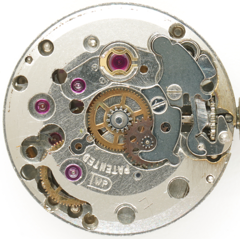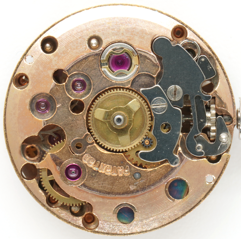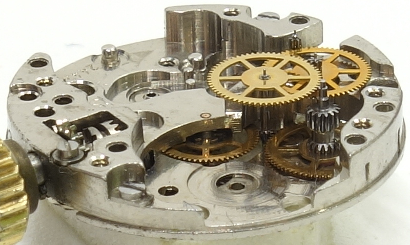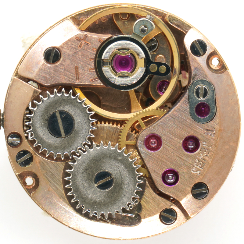 Here too, the modern, space-saving gear train arrangement was used, in which there is no central minute wheel, but the hand mechanism is driven via the pinion of the third wheel.