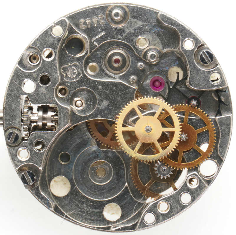 The large mainspring barrel is connected to second wheel with its thick axle, followed by the third wheel, seconds wheel, and escape wheel. The latter must be inserted laterally during assembly.