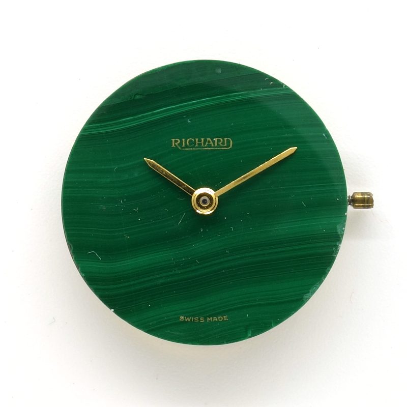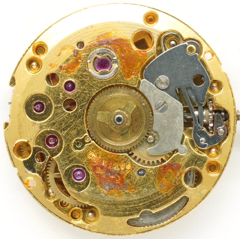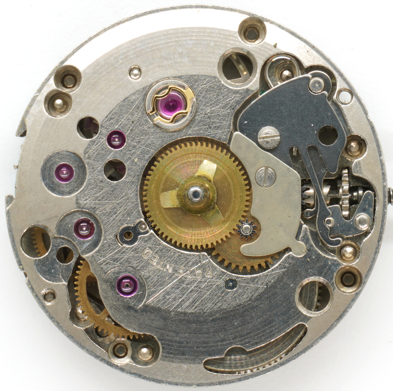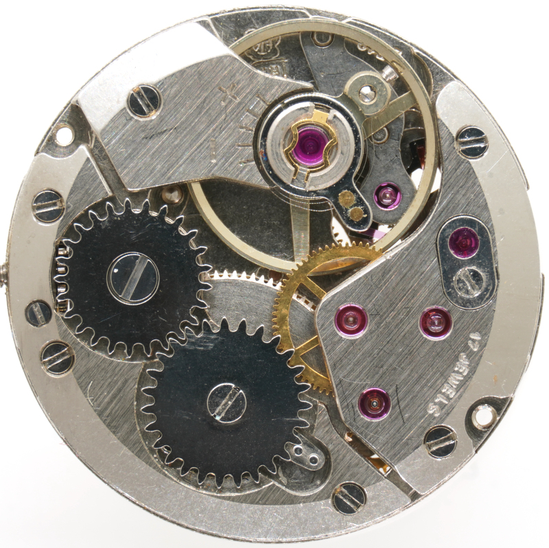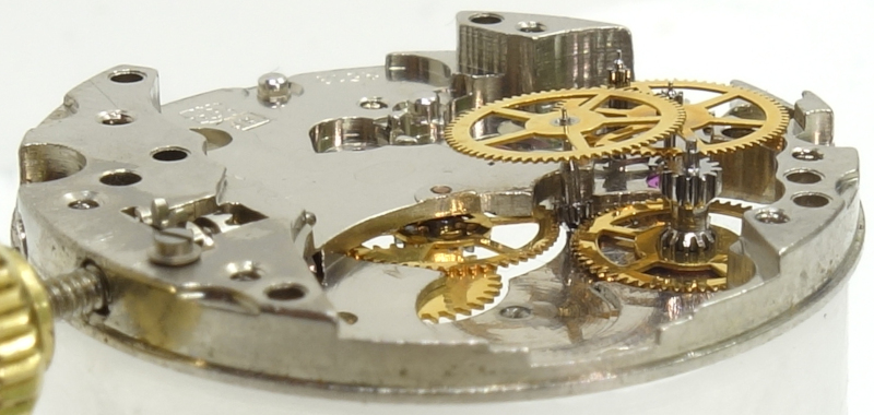 The gear train design is again the same modern design with a missing central minute wheel and drive of the dial-side hand mechanism via the third wheel pinion.