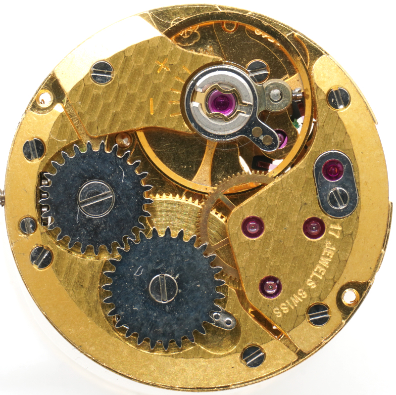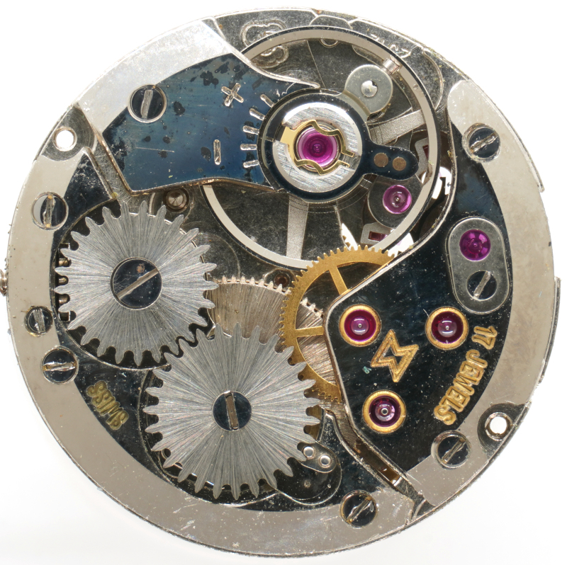 The hand mechanism is driven on the dial side by the third wheel pinion, which acts on the minute wheel. On this, equipped with a slip clutch, is the cannon pinion mounted, into which the intermediate wheel engages, which in turn rotates the hour wheel.