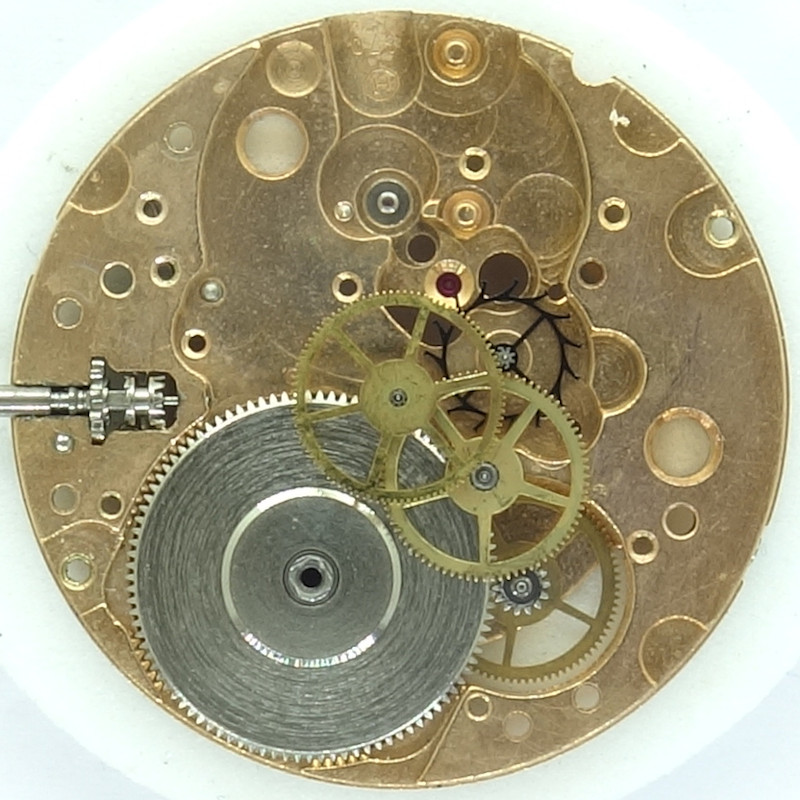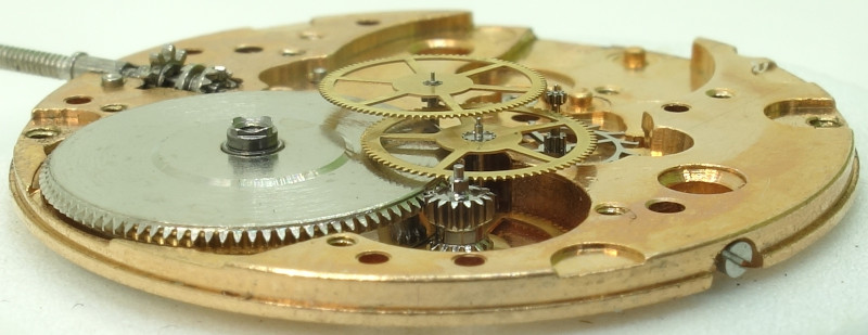 The contemporarily very modern gear train is used by ETA until today in their movements: Mainspring barrel, second wheel, third wheel, directly driven center seconds wheel and finally the escape wheel.