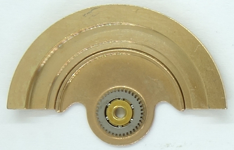 As usual, the selfwinding mechanism consists of two pawl changers, which are engaged to each other by their lower gears, while the upper gears are driven by the oscillating weight.
