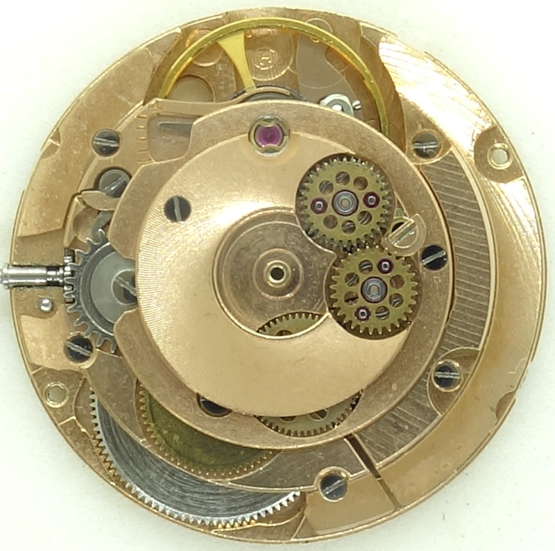 It’s interesting to see, that the early ETA selfwinding movements have pawl wheels with hollow drives, mounted on very massive axles of the selfwinding plate. Run-in pinions like on modern ETA movements don’t exist there.