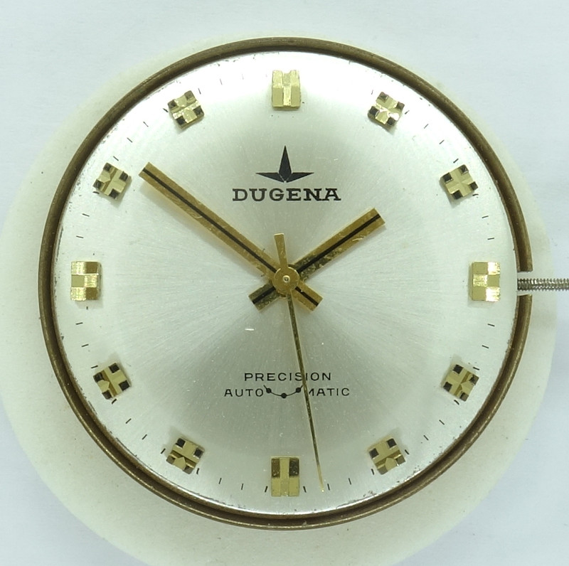 Helvetia also offered this movement and probably improved it (red-golden coloring of the movement, Glucydur balance) and called it “Helvetia 870”. And since that is not enough, the german Dugena also used this movement for their “Precision” line of watches and called it “Dugena 1076”.