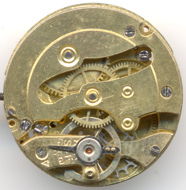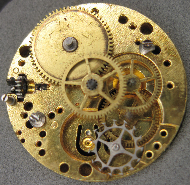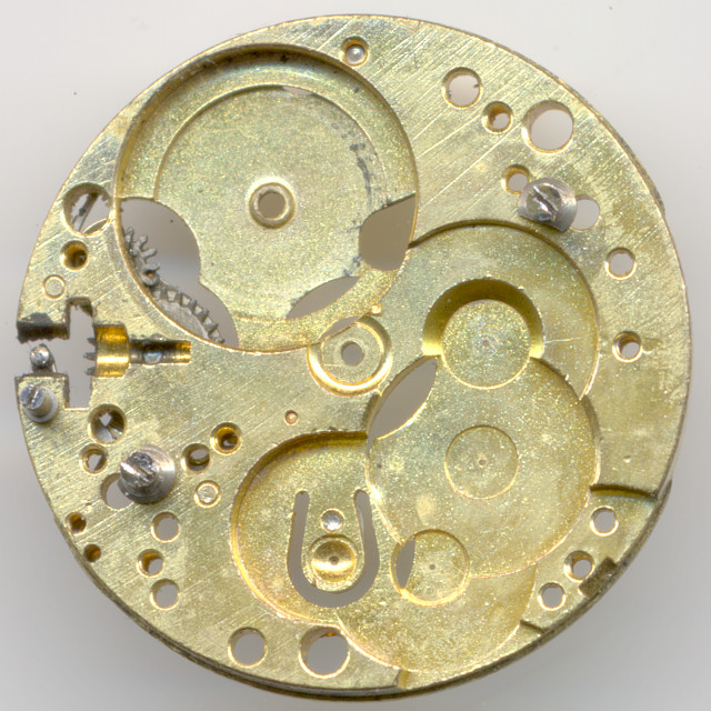 On the base plate, you see, that there are no ruby bearings. Only the balance wheel has got a single ruby bearing on the cock.