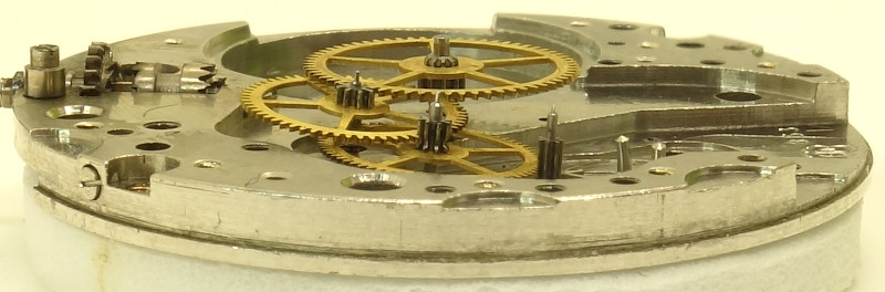 The mainspring barrel drives the center minute wheel, followed by third wheel, seconds wheel at 6 o’clock (with prolonged axle on the dial side to carry a seconds hand) and steel escape wheel.