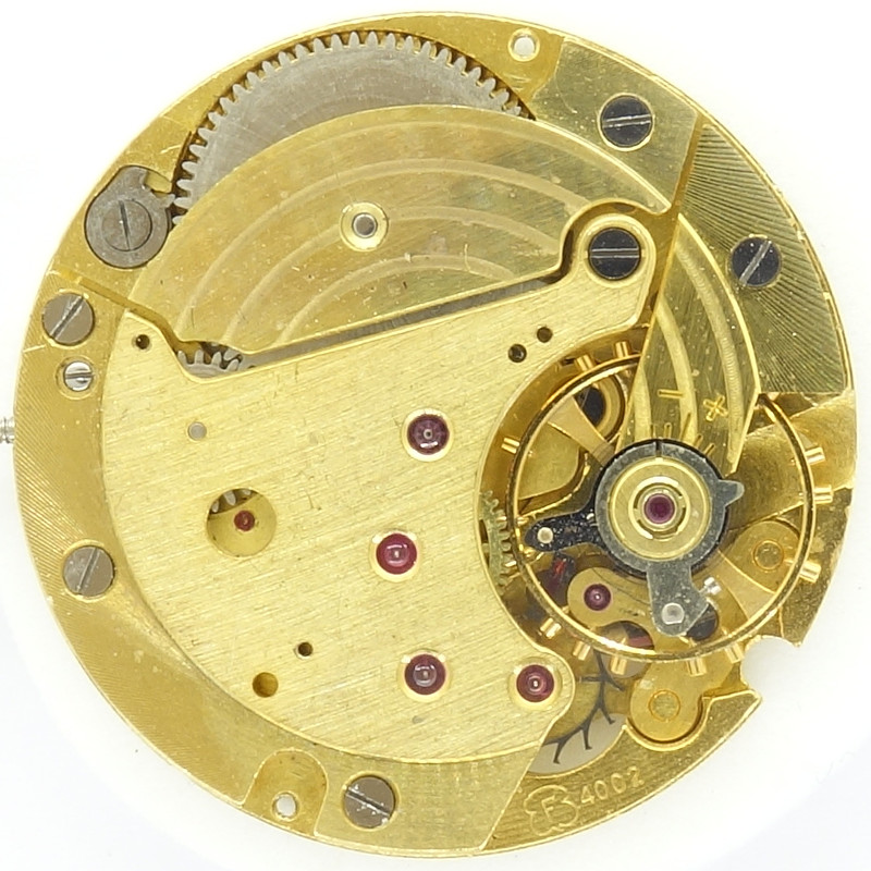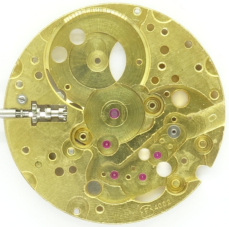 We have an old-fashioned gear train on the Felsa 4002: The large mainspring barrel drives the center minute wheel, followed by third wheel, seconds wheel (at 6 o’clock, so in theory, it could carry a decentral seconds hand on the dial side) and finally the steel escape wheel.