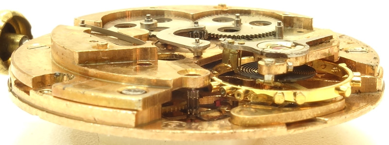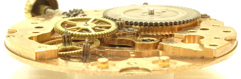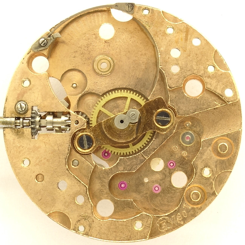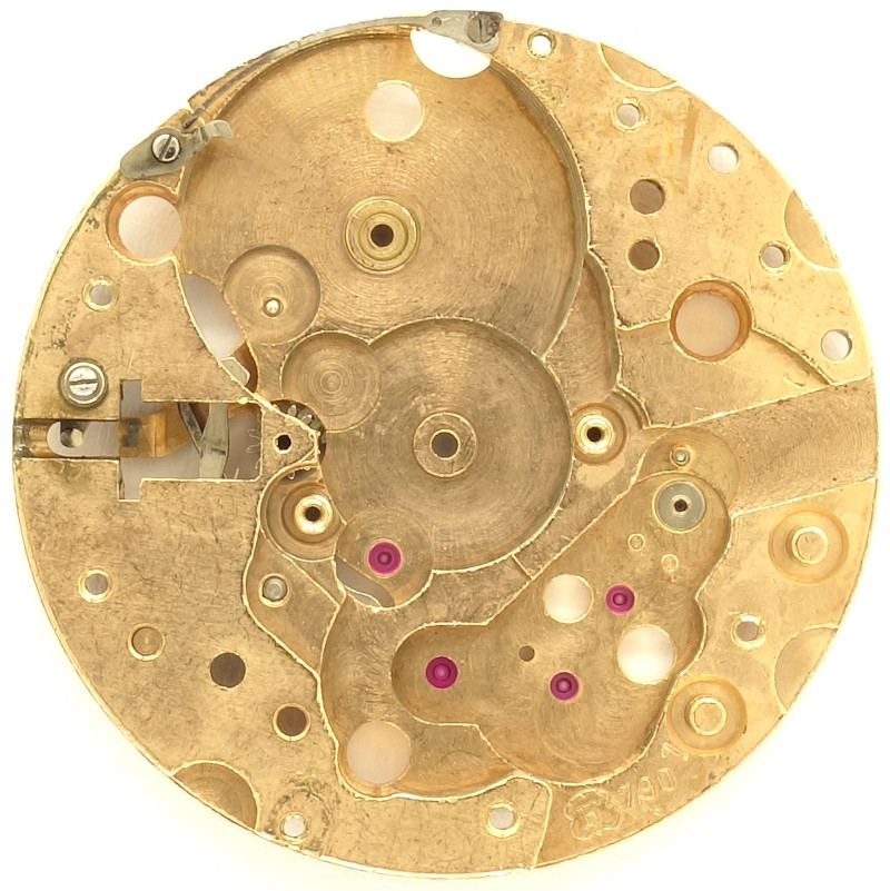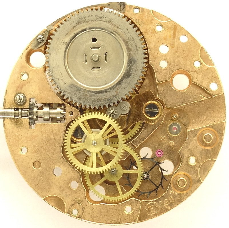 A little speciality of the Felsa 790 construction is the crown wheel: It is located on the inner side of the gear trian bridge, which also bears the mainspring barrel.