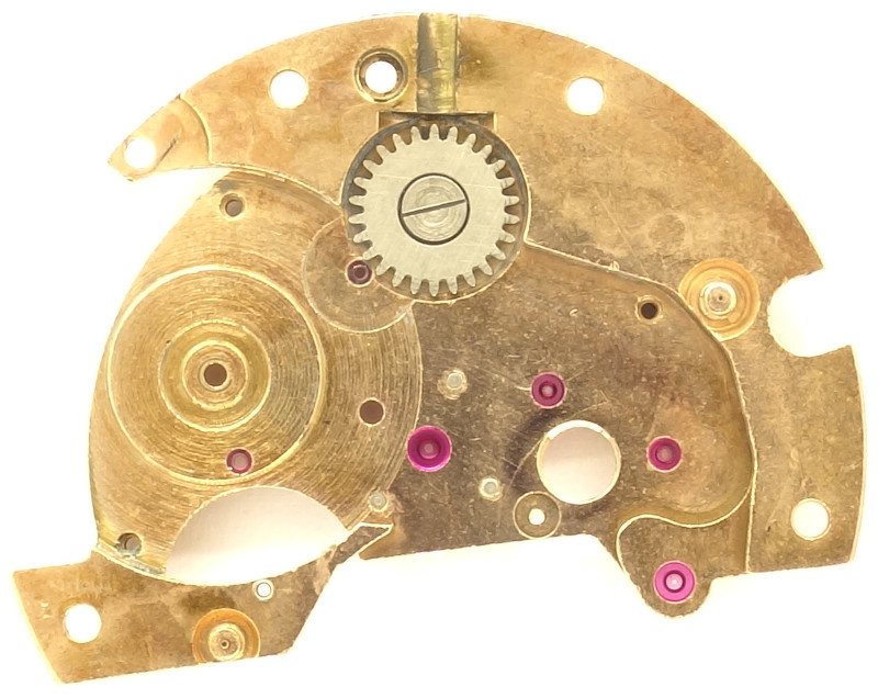 The oscillating weight, which unfortunately is missing on the specimen shown here, is axle beared. The axle is mounted with three screws on top of the gear train bridge.