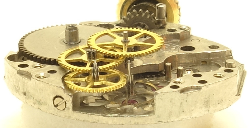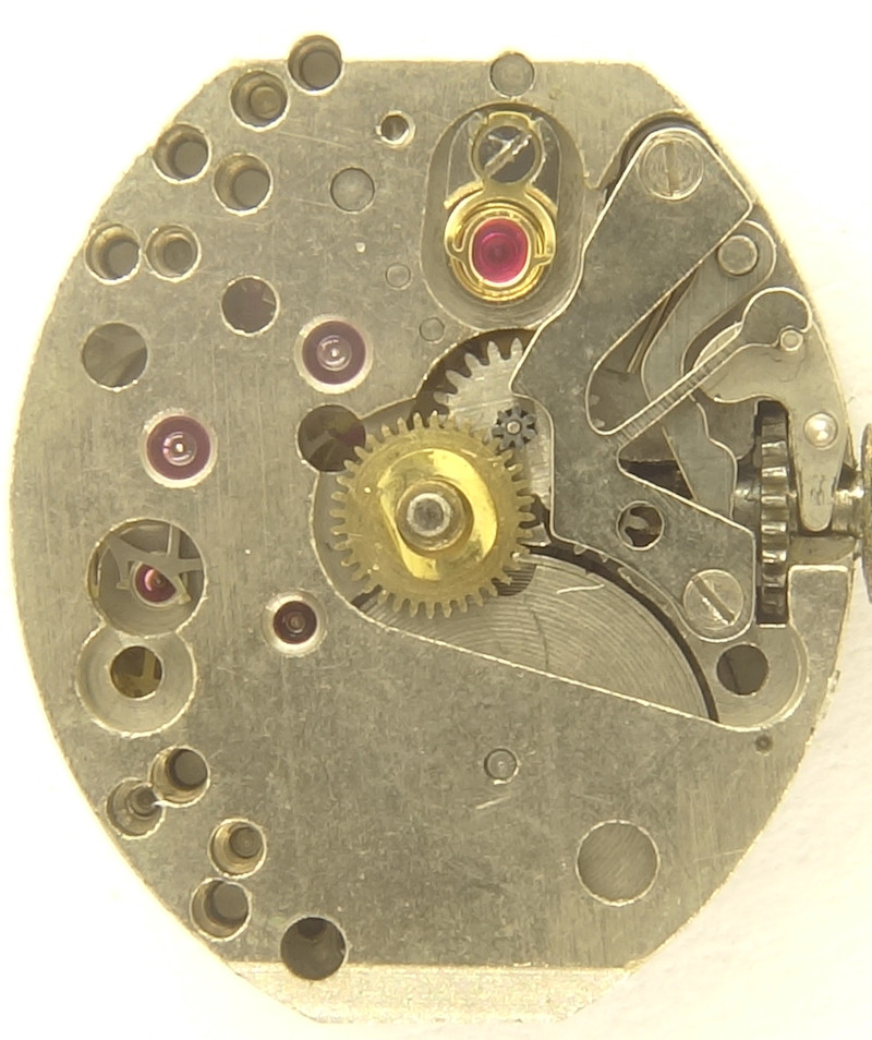 As common for this kind of movement, a classical, two-storey gear train is used with directly driven center minute wheel, third wheel and seconds wheel above the steel escape wheel.