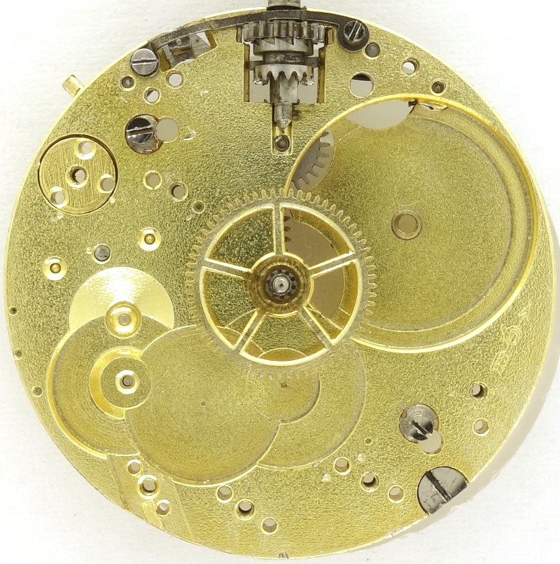 The gear train is typical for a movement with cylinder escapement: The mainspring barrel drives the center minute wheel, followed by third wheel, seconds wheel and cylinder wheel.
