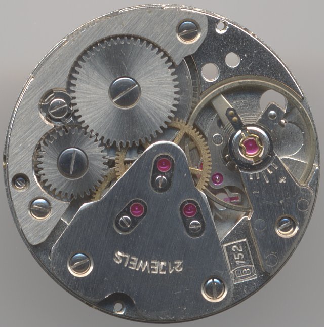 The construction of this movement is very classic, with a balance with two legs and a direct driven center second. But there are also a few notable anomalies, such as the Incabloc shock protection, the extensive usage of deck jewels and the winding pinion with its conical dents (look at the dial side!).