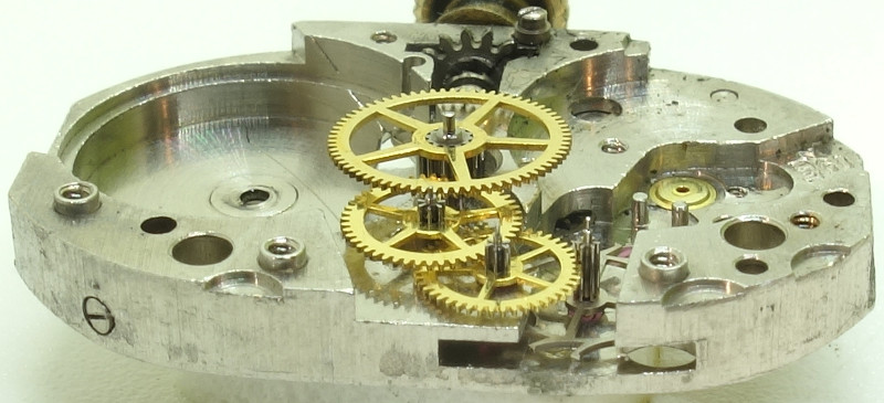 We have the classical gear train here with directly driven center minute wheel, followed by tiny third and seconds wheels and finally the larger, very filigree escape wheel.