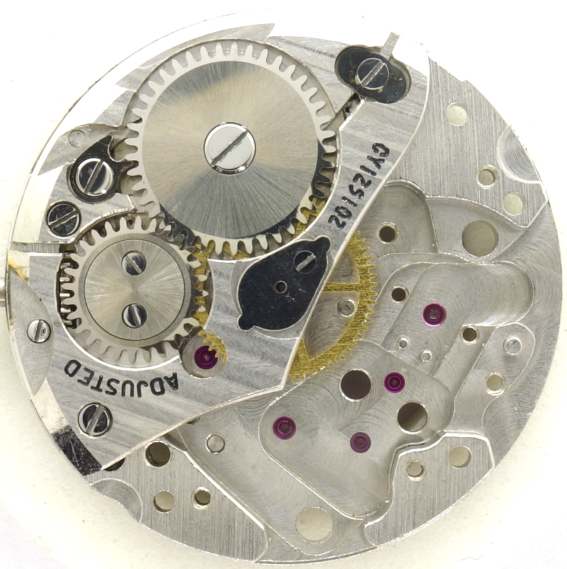 The gear train has one more wheel than usual: The mainspring barrel drives the central minute wheel, followed by the third wheel, central seconds wheel, seconds wheel (with a very large pinion, actually even a separate wheel) and the escape wheel, which is recognizably counterclockwise.