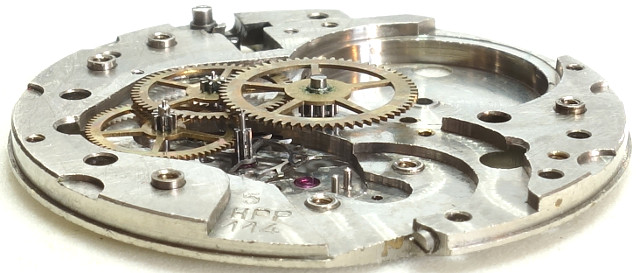 Thanks to the large plate, the movement train could be made one-storey and flat with a large mainspring barrel, directly driven center minute wheel, third wheel, seconds wheel and steel escape wheel.