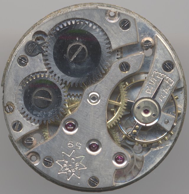 It has got a slim and thus vintage looking screw balance, which is not shock protected, a long regulator arm for an easier regulation and in sum fifteen jewels. It’s noteworthy, that those jewels, which are not viewable, since they are on the dial side, are only slight red, almost transparent, while those, which can be seen on the movement plate are dark red. Maybe this was done for cost cutting during the war years.