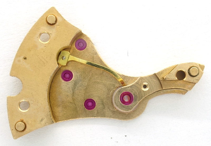 The third wheel simultaneously drives the seconds wheel and the central seconds pinion, which runs in a lowered bearing of the gear train bridge. A friction spring underneath ensures that it does not flutter or jump. This construction was patented by Junghans in 1952.