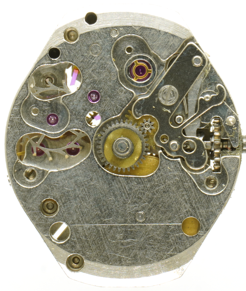 We have the typical gear train for these kind of movements: The mainspring barrel drives the center minute wheel, followed by third wheel, seconds wheel and large, filigree escape wheel.