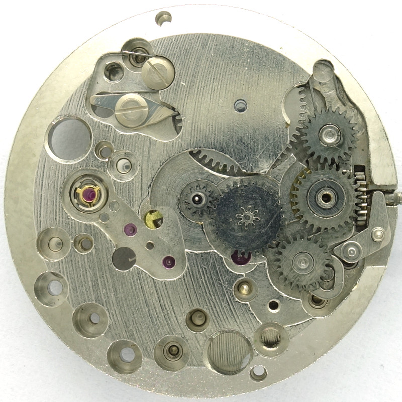Even if the execution appears rather cheap, it is sufficiently well-equipped with its pallet lever escapement and the total of 17 jewels. However, the two upper cap jewels have no real function, as the pivots of the escapement- and third wheel do not even extend through the bearing jewels.